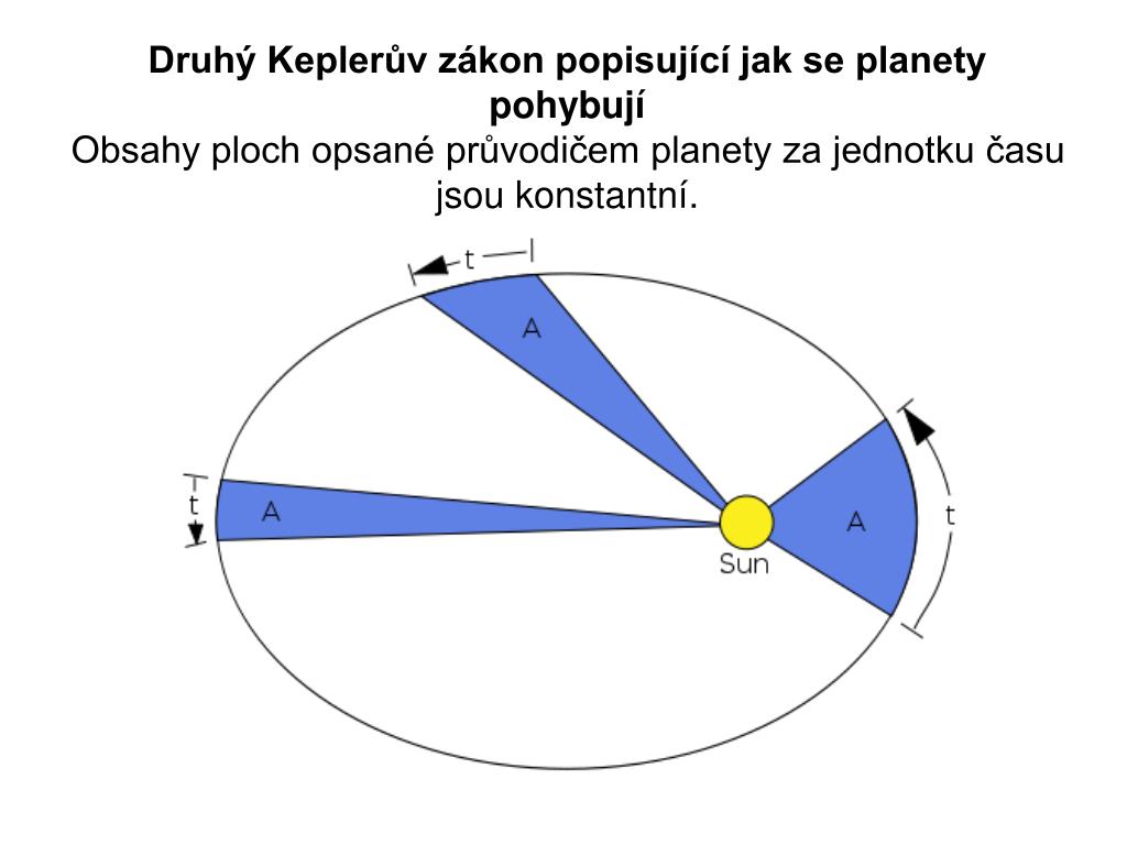 Prakticky z toho plyne, že čím blíže je …. Druhý keplerův zákon obsahy ploch opsaných průvodičem planety (spojnice planety a slunce) jsou za stejný čas stejně velké. Obsahy ploch opsaných průvodičem planety za jednotku času jsou konstantní. Tento zákon je vlastně geometrickým důsledkem zákona zachování momentu hybnosti, který je definován vztahem ( 82 ). Jeho velikost i směr se během pohybu planety stále mění, ale obsahy ploch, které opíše za stejné doby jsou stejné.