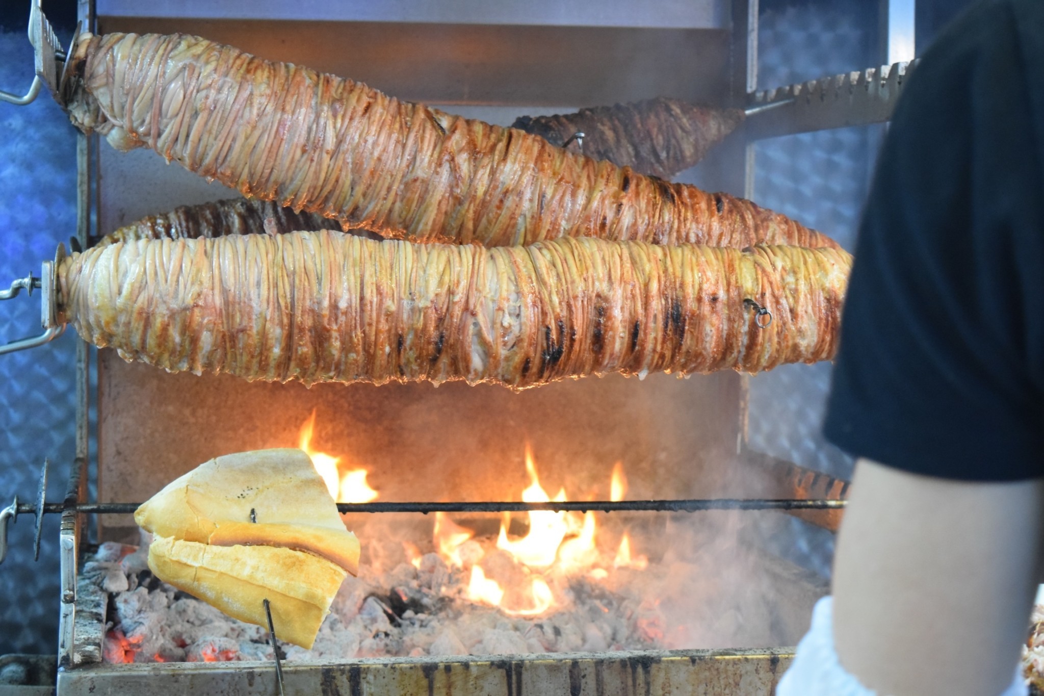 Ellerine sağlık fırat usta üstüne tanımıyoruz üçkuyulardaaa :) Kokoreç şişleri özel hazırlanmış mangallarda yatay bir konumda asılı bir şekilde ve döndürülerek kıvama gelene kadar pişirilir... Ellerine sağlık fırat usta üstüne tanımıyoruz üçkuyulardaaa :)
